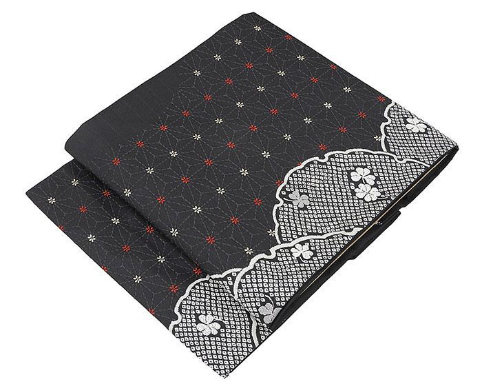 黒地にグレーや赤・クリーム色などの多色で雪輪麻の葉小花模様が柄付けされています。