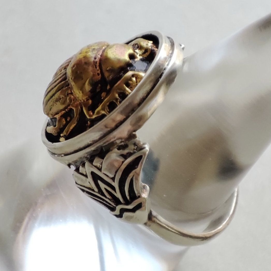 正面にはスカラベ、両側に蓮のモチーフをあしらったリングです。