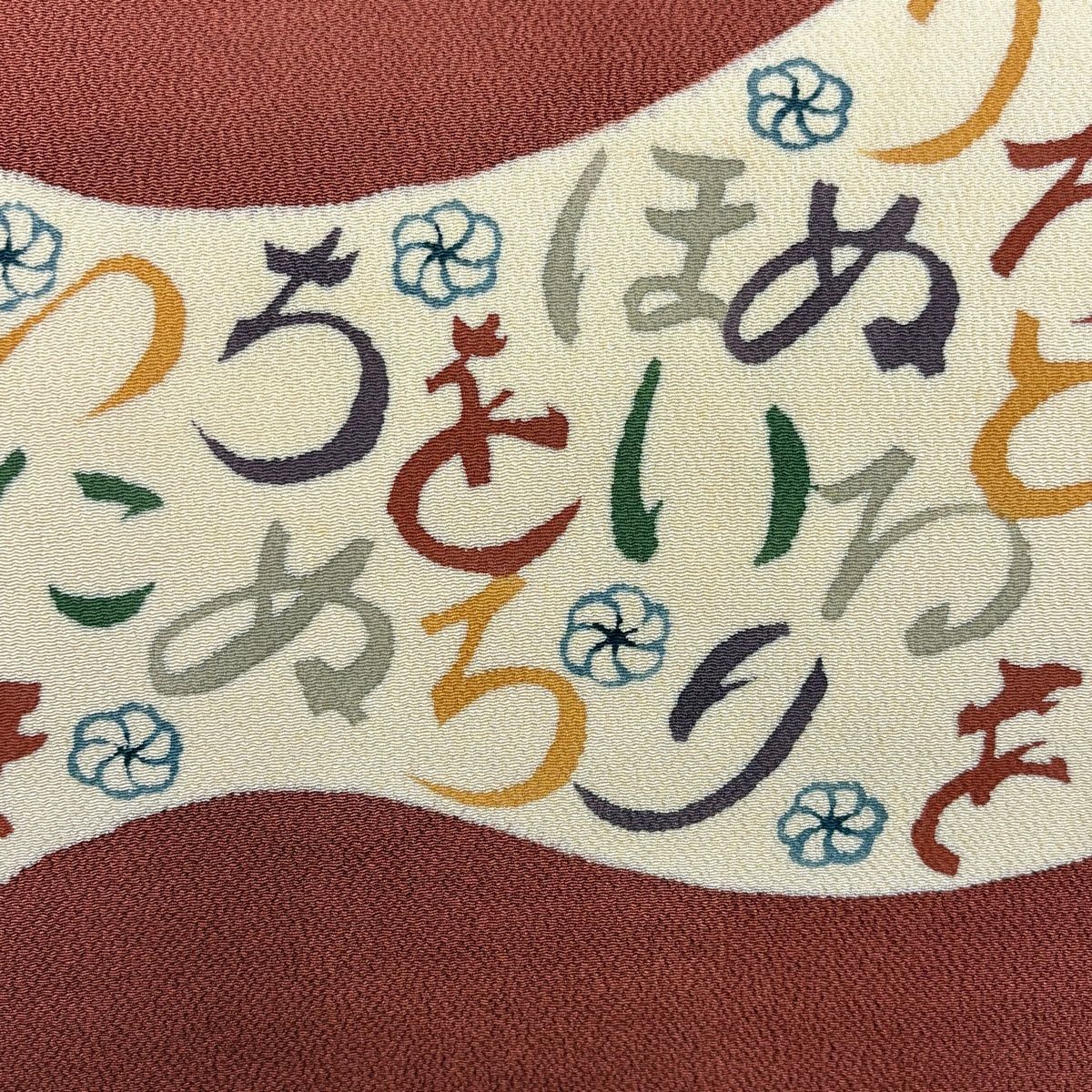 名古屋帯 秀品 文字文 花 縮緬 赤茶 正絹