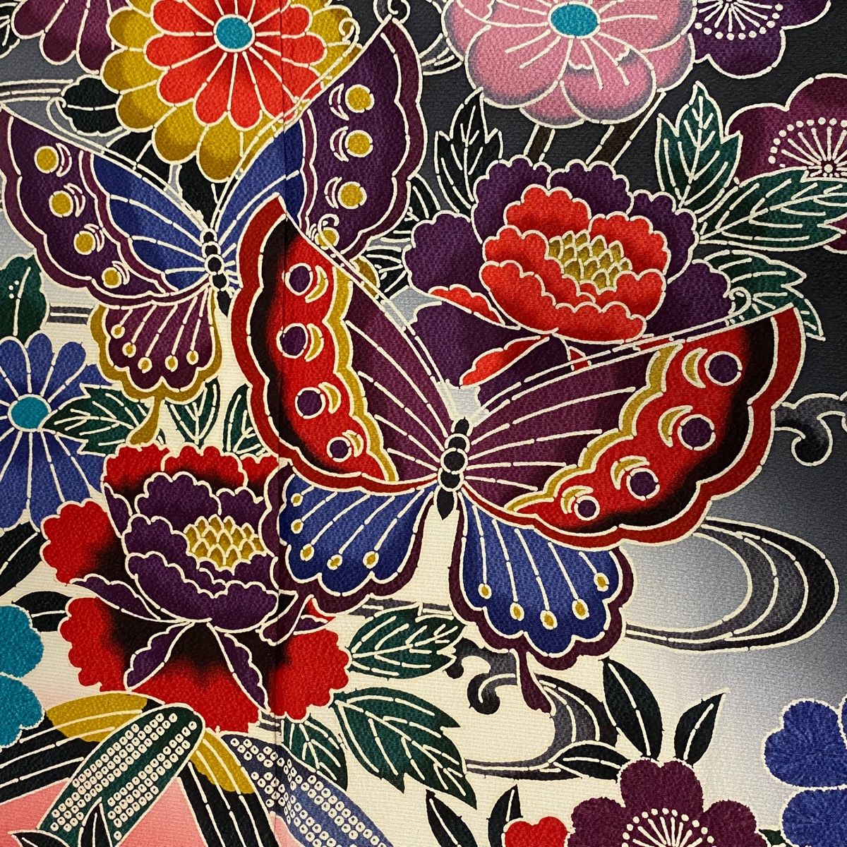 振袖 身丈162 cm 裄丈65.5 M 袷 蝶 草花 染分け ぼかし 墨色 正絹