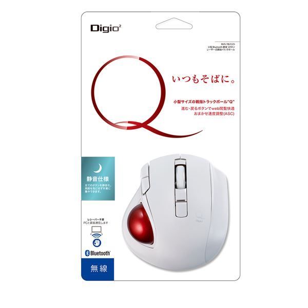 ●静かで小さな親指トラックボール「Q」シリーズ…全てのボタンを静音化。周囲を気にせず操作に集中できます。トラックボールはマウスと違い本体を動かさないので、狭い場所やソファの上でも操作できます。<小さい>34mmボールを搭載しながら、ポケットサイズまで凝縮。薬指と小指が自然な位置に置ける使いやすいフォルムです。<全てのボタンが静音(ホイールスクロール含む)>周囲を気にせず操作に集中できます。<おまかせ速度調整(AutoSpeedControl)>ポインターの速度をトラックボールの動きに合わせて調整するおまかせ機能。SPEEDボタンを押すだけで固定モードと切り替えられます。<ラクラクWEB閲覧(5-button)>Web閲覧を快適にする進む・戻るボタン。<ボタンの割当変更可能>「ホイール・進む・戻る」ボタンを他の機能に変更することができます。当社ホームページからマウス割当ソフト[Digio2MouseSetting]をインストールしてください。※<レーザーセンサー>読み取り精度の高いレーザーセンサーを使用(光は見えません)。<セラミック支持球>丈夫で抵抗感が少ないセラミック支持球でボールを支えます。