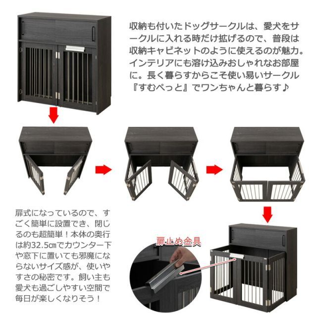 説明収納する物にこだわったカウンター下収納【Blacker】カウンター下収納シリーズ。ワンタッチでたたんでしまえる収納型ケージ。インテリア性も兼ねたペット家具『すむぺっとシリーズ』。収納も付いたドッグサークルは、愛犬をサークルに入れるときだけ広げるので、普段は収納キャビネットのように使えるのが魅力!本体の奥行は約32.5cmでカウンター下や窓下に置いても邪魔にならないサイズ感が使いやすさの秘密です。また、棚板を支えるダボにはネジダボを採用。通常の差し込みのダボでは穴がきつく、一度はめると取れにくくなったり、スポッと取れて棚板が落ちる事が多々あります。ネジ式ダボはそんなストレスも解消!しっかり設置して位置変えも簡単です。長く暮らすからこそ使い易くお洒落なサークルが◎他のシリーズと合わせて、キッチンやリビングなどでお洒落に収納できます。