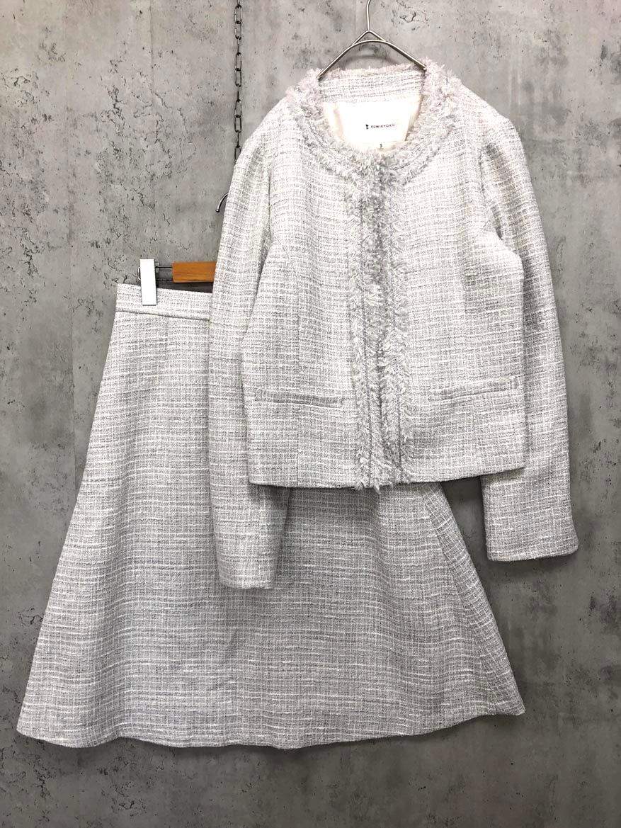 組曲 ラメループ モールツイード ジャケット スカート セットアップ スーツ size 3|ライトグレー系 ◎レディース