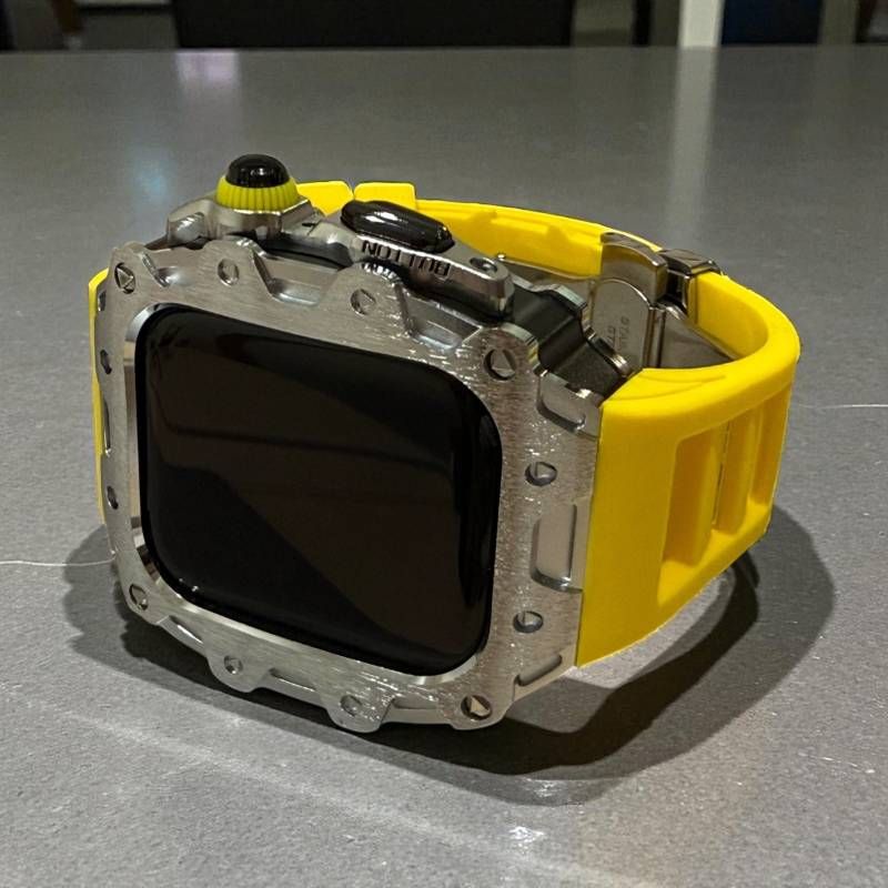 アップルウォッチケース フォージドステンレス ラバー 互換性対応 カスタム カバー 保護 ギフト 46mm ベルト バンド セット series 10 11 メンズ レディース 贈り物 イエローシルバー