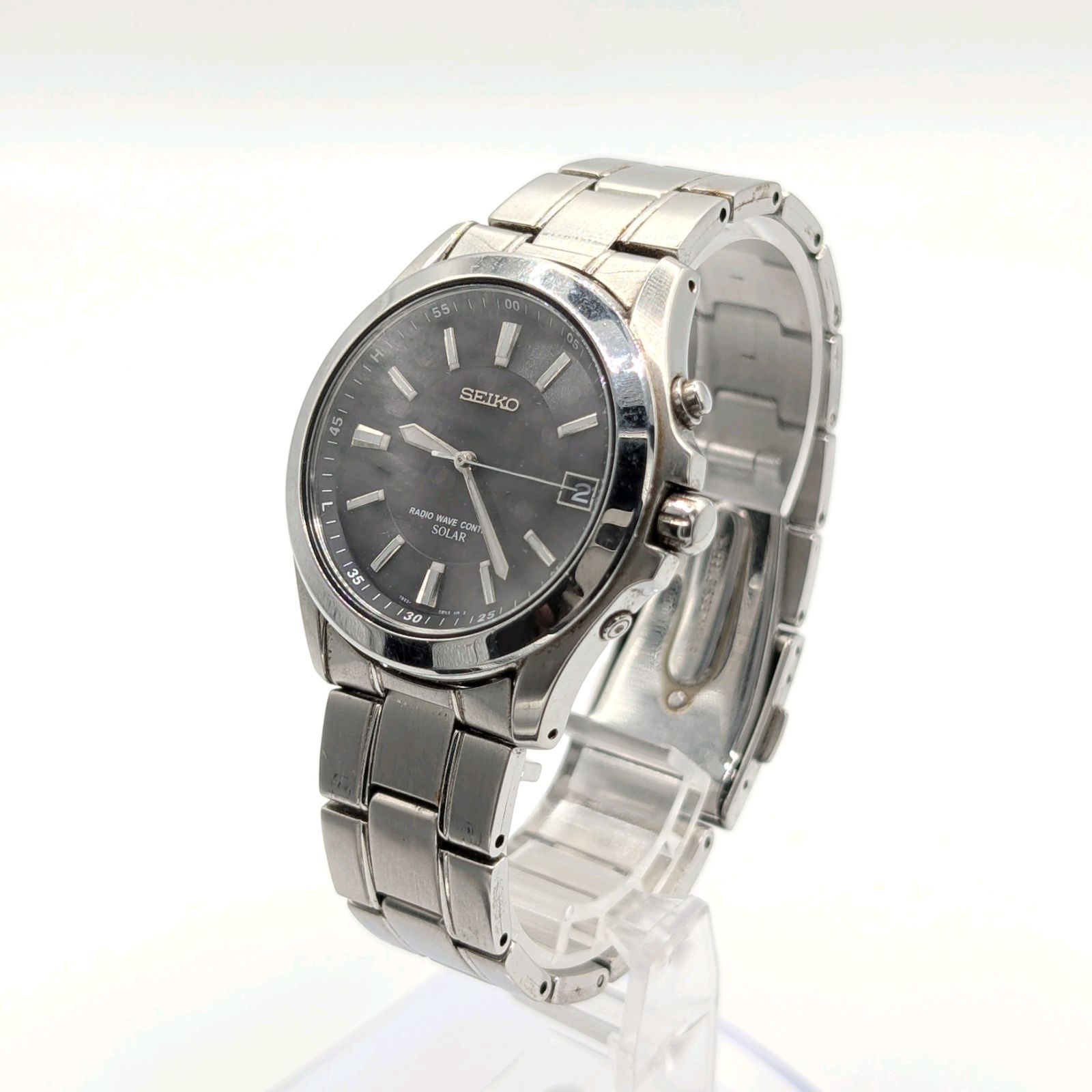 SEIKO 7 B 52-0 FA 0 Watch Solar Men s Round Silver Working セイコー 時計 ソーラー 電波ソーラー メンズ ラウンド シルバー 黒文字盤 デイト 稼働品