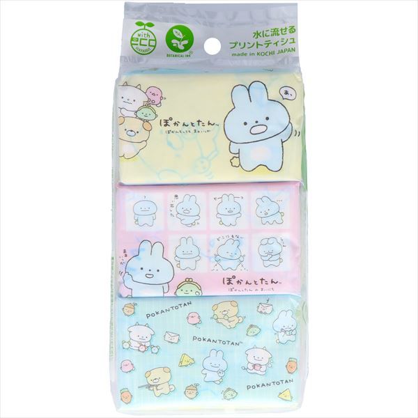 どこか抜けてるちょっぴり忘れっぽいうさぎ「ぽかんとたん」の水に流せるポケットティシュです。キュートなプリント入りです。