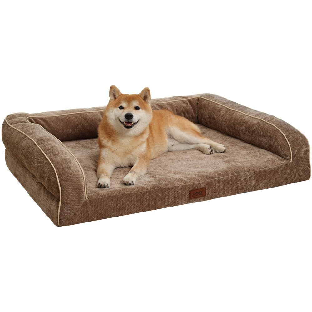 EMME 耐噛み 犬用ベッド 防水 丈夫 ペットベッド 洗える シェニール生地 柔らか ペットソファー 小型犬 中型犬対応 犬 ソファーベッド 耐久性 高反発 抗菌防臭 ペットクッションあごのせペット用ベッド 猫 犬 室内用 寝床 高齢犬 子犬 介護用 ふわふわ枕付き滑り止め取り外せるカバー 92x71x24cm モカ Lサイズ