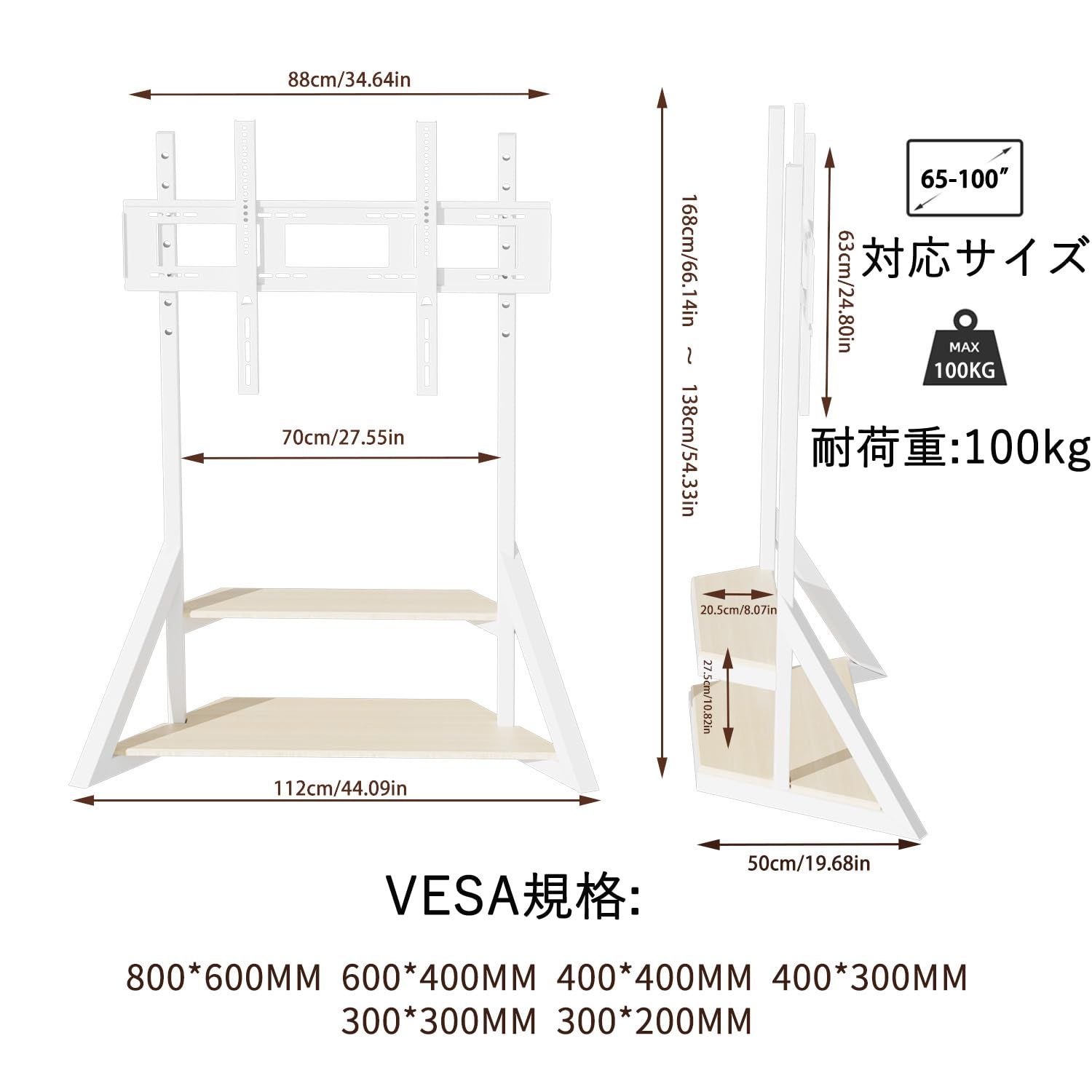 【100インチのテレビまでに対応できる】VESA規格(テレビ背面のネジ穴間の距離)は200x200mmから800x600mmまで対応可能で、重量約100kg以下、65~100インチまでのテレビやモニターが取り付けられます