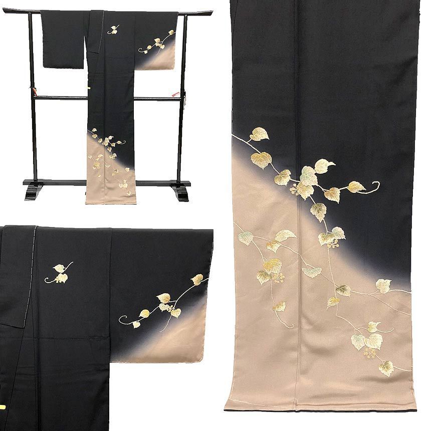 [商品名]京やB103 特選 正絹 訪問着 付下げ 附下 付け下げ訪問着 ブラック 黒 グラデーション 相良刺繍 身丈165cm 裄70cm 裄長め 身幅大きめ トールサイズ ワイドサイズ ゆったりサイズ フォーマル〜セミフォーマル ガード加工済み 仕立て上がり リサイクル着物 未使用 新古品