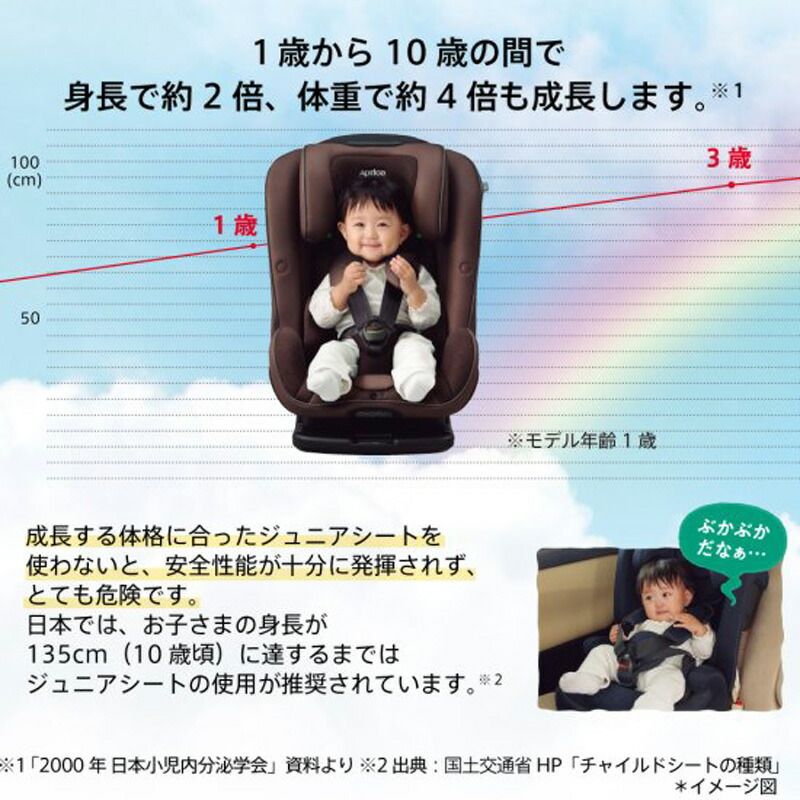 1歳から10歳の間で身長で約2倍、体重で約4倍も成長するお子さまのカラダに、ずーっとフィットするから、ずーっと笑顔で安全ドライブ。
