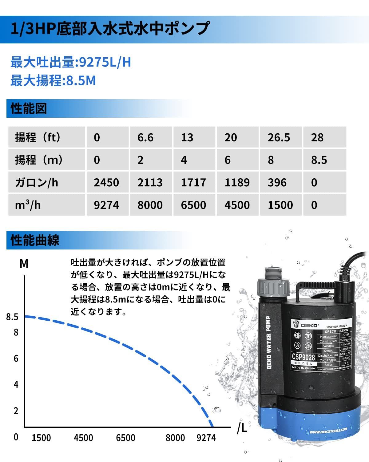 水中ポンプ DEKO 排水ポンプ 底部入水式 循環ポンプ 最大吐出量9275 L H 最大揚程8.5 M 強力 ポンプ 汚水 清水両用 50 60 Hz共用 電動ポンプ 水耕栽培 水槽ウォーターポンプ 水族館 給水 散水ポンプ