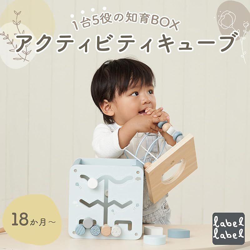 ベルギー生まれの可愛い知育玩具「label label(レーベルレーベル)」トレンドのくすみカラーがお部屋をおしゃれに演出します。アクティビティキューブは、ルーピングのビーズ遊び、形合わせのはめ込み遊び、鉄琴の音あそび、くるくる回す回転遊び、つまんで動かす迷路遊びが楽しめます。万が一舐めても安全な塗料を使用。ヨーロッパの安全基準「CE」と日本の食品衛生法にも合格しています。