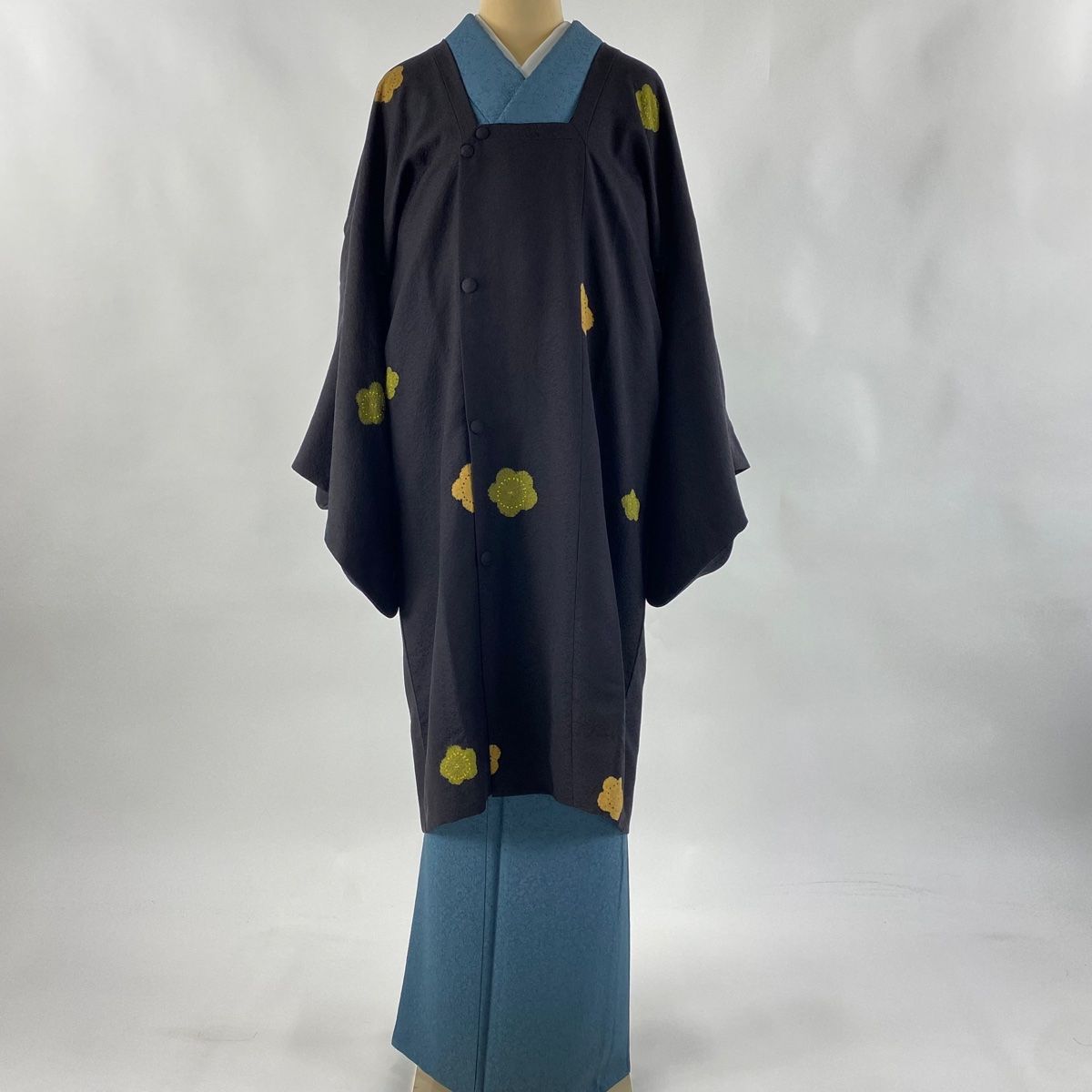 道行 身丈106 cm 裄丈69 L 和装コート 角衿 梅 金彩 絞り 黒 正絹