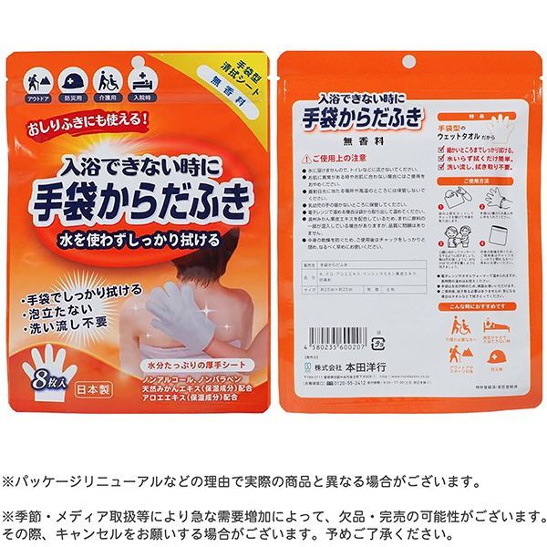 24袋セット 体拭きシート 手袋 からだふき 入り 無香料 手袋タイプ 手袋型 水不要 タオル不要 拭くだけ 低刺激 ノンアルコール 災害 アウトドア 入院 介護 みかんエキス配合 保湿成分配合 おしり拭きシート ノンパラベン 本田洋行