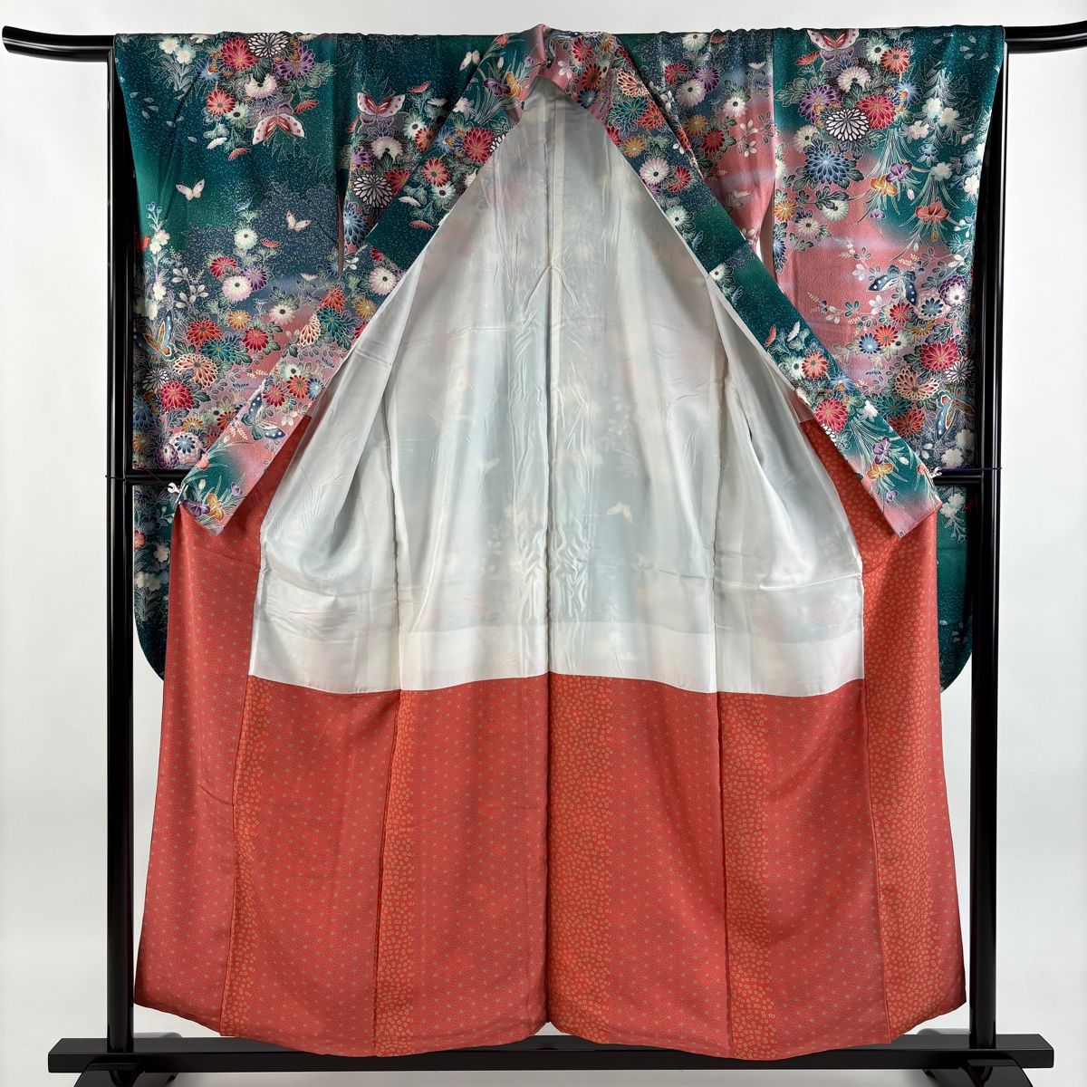 振袖 身丈155.5 cm 裄丈66.5 M 袷 菊 蝶 金銀彩 ぼかし 緑 正絹 秀品