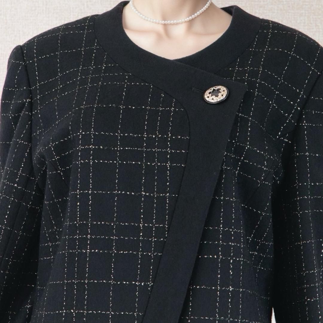 ◆重厚感のあるブラックのメルトン生地に、銀ラメ糸で施されたチェック柄が気品と優雅さを添えます。ノーカラーのジャケットは、縁取る無地の切り替えと、斜めに重ねたアシンメトリーなフロントデザインが印象的です。襟元にあしらわれた煌めくモチーフボタンが洗練されたアクセントに、内側はブランドロゴの刻印入りの隠しボタンで留める仕様です。すっきりとしたラインのタイトスカートと合わせたセットアップは、女性らしさを引き立て、ノーブルな佇まいを演出します。