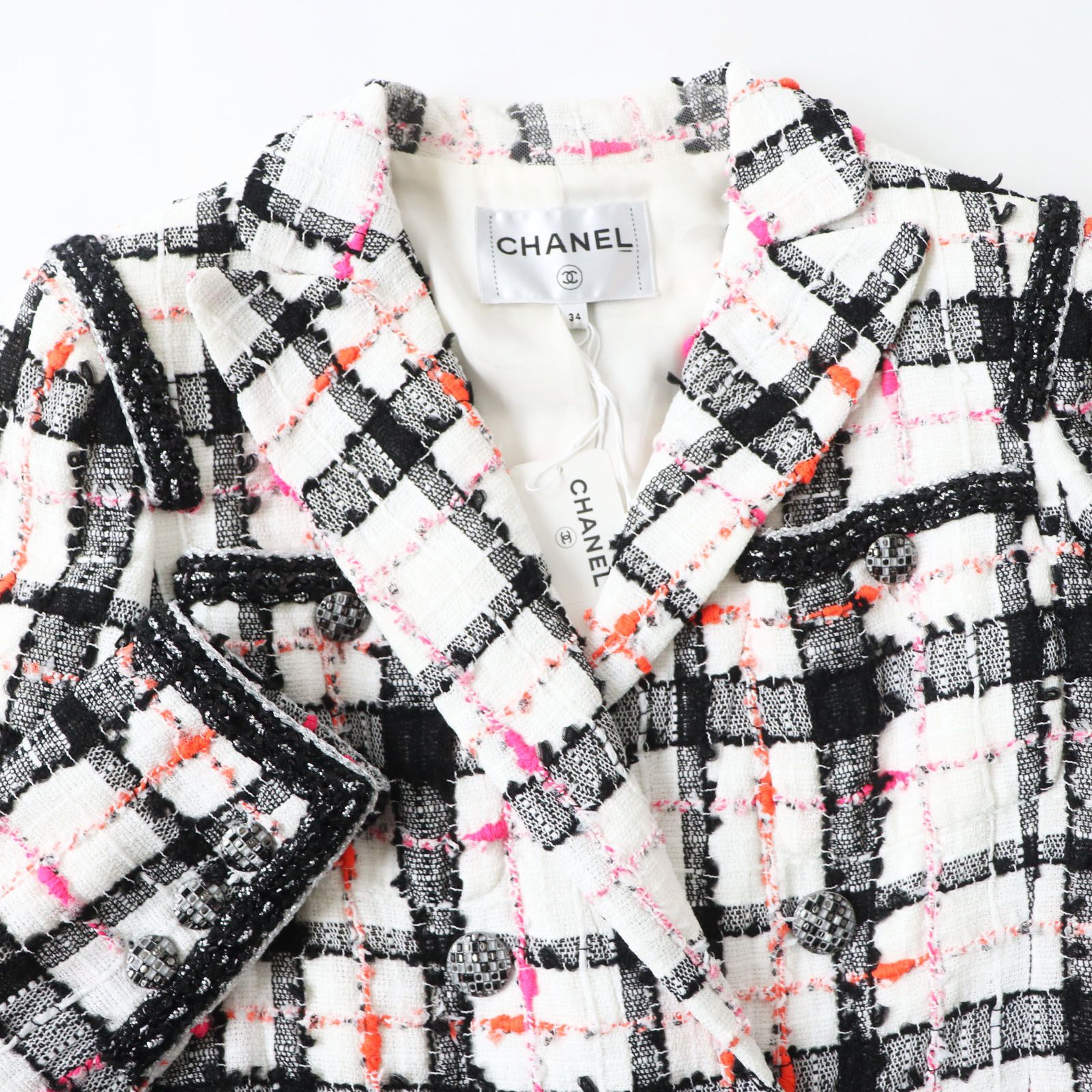 CHANEL シャネル 20 S P 64167 ホワイト ブラック ピンク オレンジ ジャケット風 ツイード ジャンプスーツ オールインワン 34 フランス製 レディース 定価652 080円