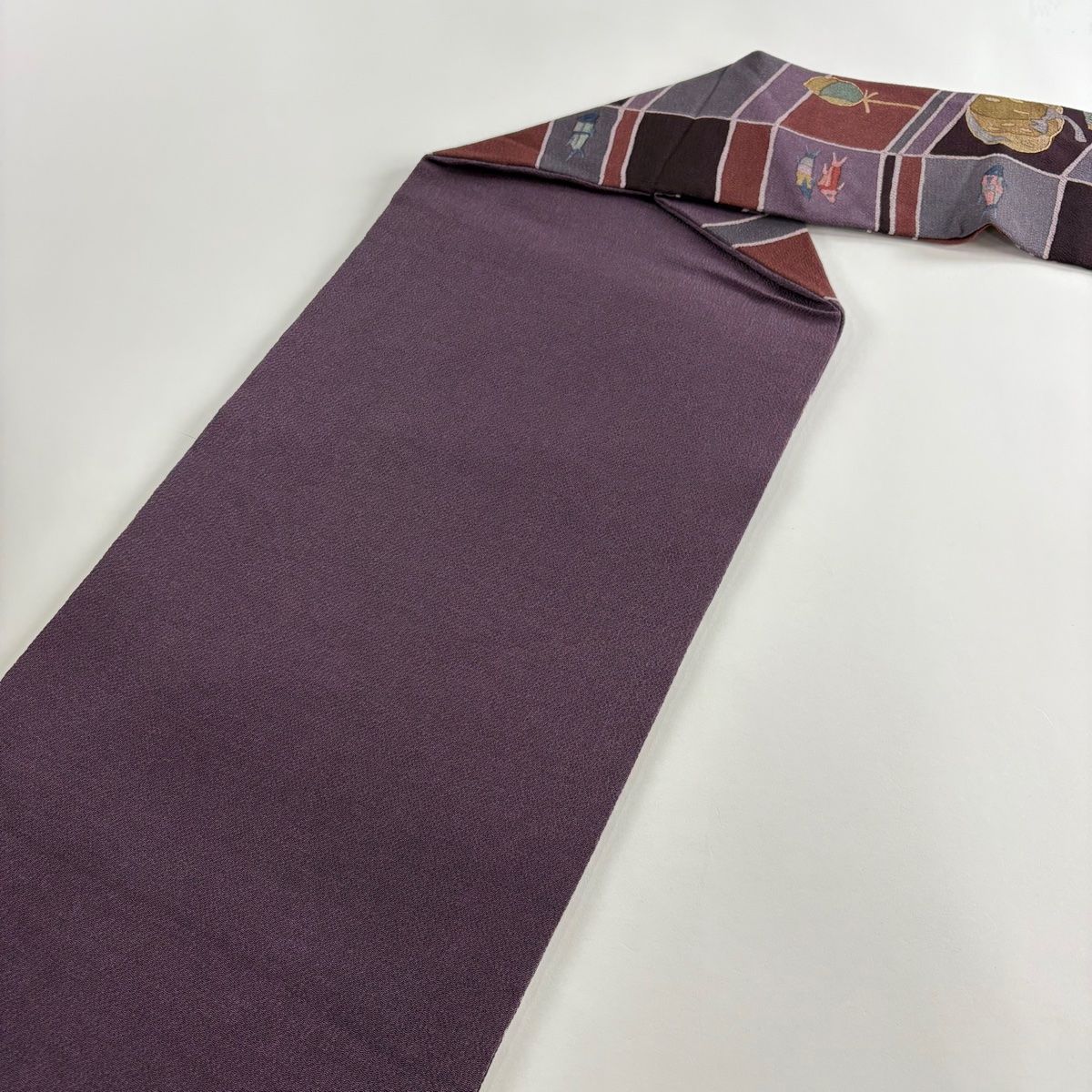 名古屋帯 秀品 生り物 魚 金彩 縮緬 紫 正絹