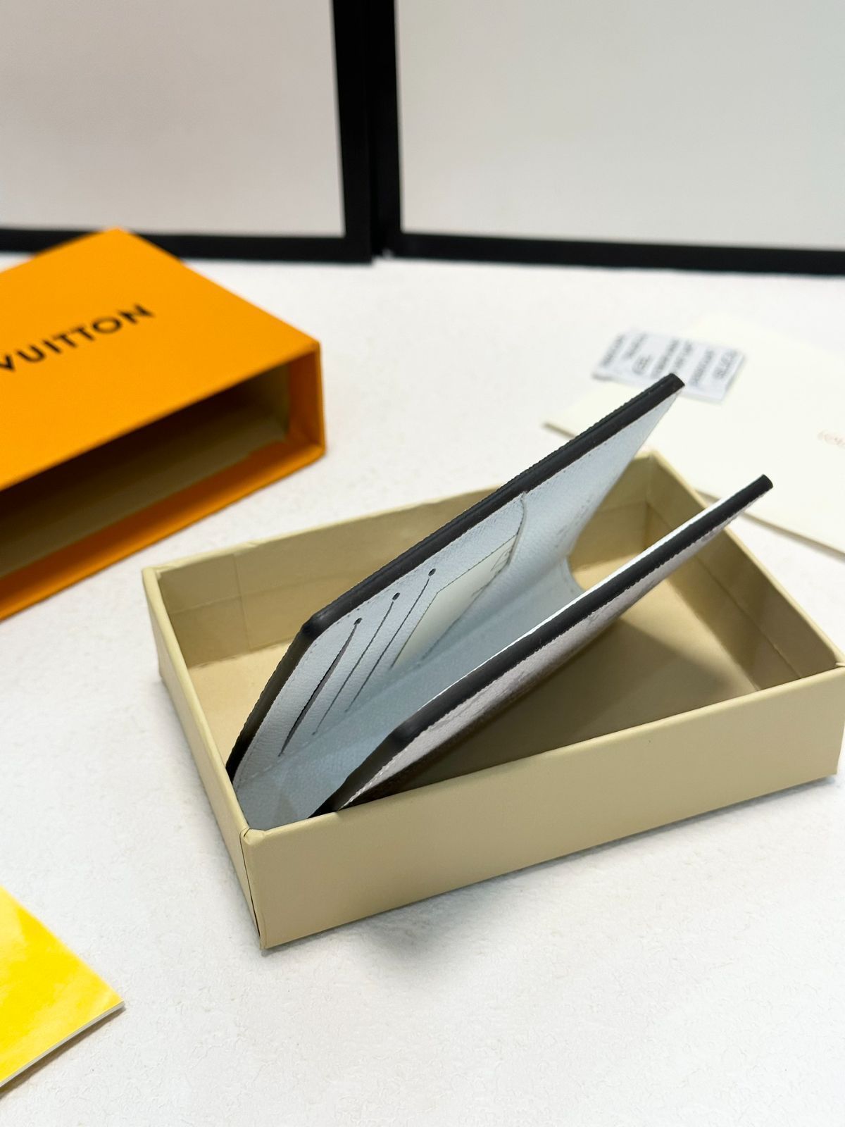皆様、こちらは COIN のグレーのカードケースです。ルイヴィトンの象徴的な黒い Taiga レザーで作られ、スリムでスタイリッシュな外観です。小銭や紙幣を安全に収納するのに最適なアイテムです。内部には複数のクレジットカード用のスロットと紙幣用の仕切りがあり、さらにシルバーのジッパー付きの小銭入れが付いています。