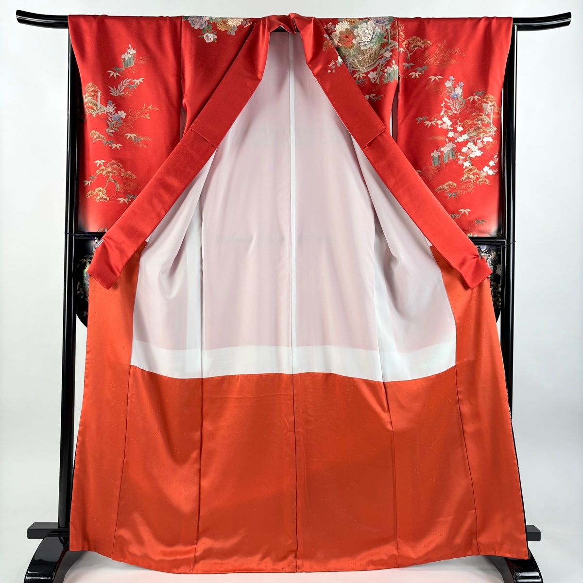 振袖 身丈167 cm 裄丈66 M 袷 花車 橋 金銀彩 ぼかし 朱色 正絹 秀品